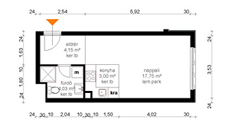 ortografikus lakásértékesítési lap: sablonba helyezett ortografikus lakásalaprajz, négyzetméter adatokkal feltöltöltve